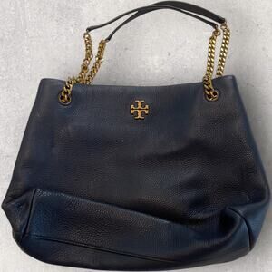 Authentic Tory Burch pebbled leather tote in a rich navy blue with signature gold-tone logo and chain shoulder straps. A timeless, elevated silhouette delivering effortless quiet luxury, old money, clean girl, city chic, workwear core, and polished everyday style.