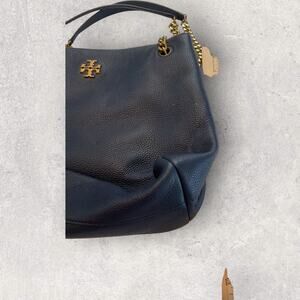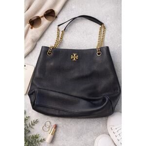Tory Burch Pebbled Leather Tote Black Gold Chain Shoulder Bag Quiet Luxury