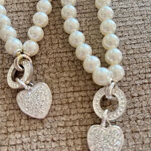 This exquisite set features a pearl necklace and bracelet, each with a dazzling heart charm. Perfect for adding elegance to any ensemble.