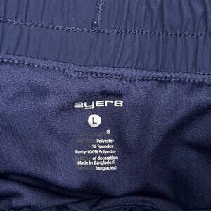Layer8 walking, running, workout navy shorts. Built in spandex underwear. Elastic waistband with drawstring. Small reflective dots on front legs. In great shape. There are two pinhead-size paint stains on back right leg.; barely visible when wearing. See last photo. 86% polyester, 14% spandex