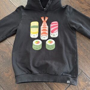 This cozy black hoodie features a fun sushi design, perfect for kids who love playful fashion. Ideal for casual wear.