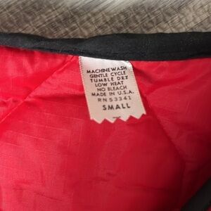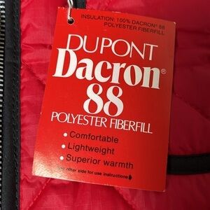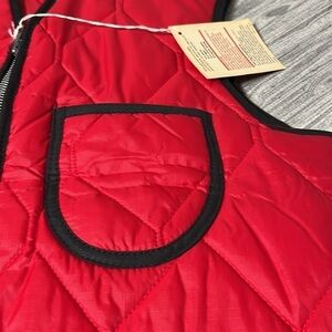 This vintage vest is a new with tags and originally created by Dupont. The vest features three front pockets along with a zipper closure and stitched Peterbilt patch. Vest is 19 inches to pit and 22 inches from shoulder to lower hem.