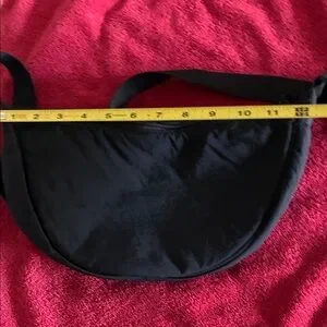 Sleek black crossbody bag with adjustable strap. Perfect for everyday use. In excellent condition, never used. Closes with a zipper, small pockets on the inside. Measures 12 inches across the top and is 6 1/2 inches deep.