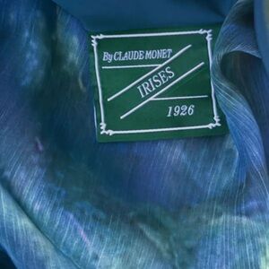 The Monet Dress celebrates one of Claude Monet's works, Irises, painted in 1914-17. The composition encompasses a poetic scene of irises growing abundantly in a garden with blurs of soft blue, purple, and green.