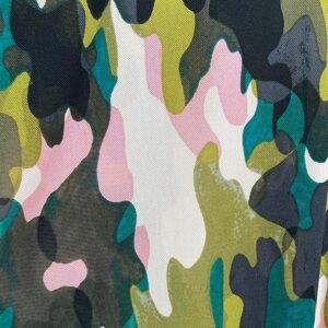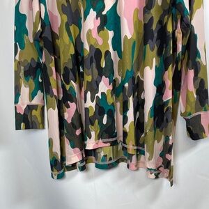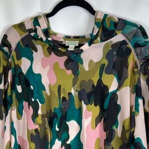 Stylish camouflage long sleeve top. Features a mix of green, pink, and black colors. Semi opaque to sheer depending on color.