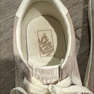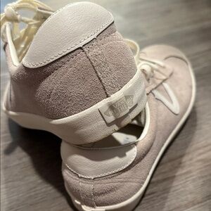 Trendy beige suede sneakers with white accents. Perfect for casual wear.