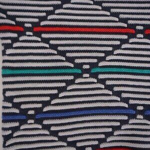 This Cezar geometric knit sweater delivers peak 90s Retro Eclectic energy with its bold, multicolor pattern and sculptural texture. The navy base sets off stripes of green, red, blue, and teal, creating a futuristic-meets-grandpa aesthetic that looks straight out of a vintage editorial. It’s loud in the best way — artsy, confident, and designed to make even a simple outfit feel expressive.
