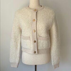 Round neck long sleeve cardigan with rib trim details and gold buttons. Front patch pockets.