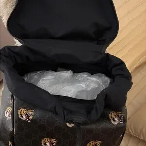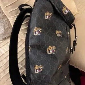 Elegant Gucci backpack with fierce tiger motifs. Black base with gold accents. Ideal for style and utility.