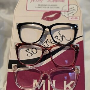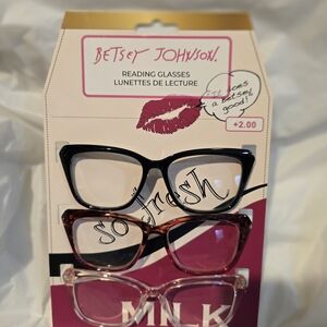 Stylish 2.00 reading glasses by Betsey Johnson. Includes black, pink, and reddish frames. Perfect for a chic look.