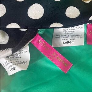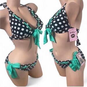Betsey Johnson Black and White Polka Dot Bikini Green Ribbon Tie Bows Retro L