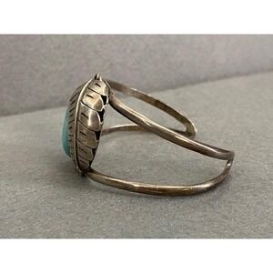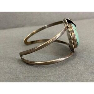 Vintage Turquoise & Sterling Silver cuff bracelet. Turquoise cabochon measures approx. 3/4" square. No maker's mark, nor mark for silver content, however, in person it is clear the item is an authentic silver bracelet handmade by a artisan likely in New Mexico or Mexico in the 1950s/1960s.