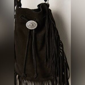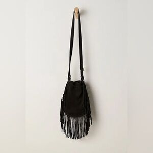 Forever cool and classic, this stunning crossbody bag is featured in a gorgeous suede fabrication and pouch-inspired silhouette with defined fringe at bottom and bolo-inspired drawstring top for an added special finish.