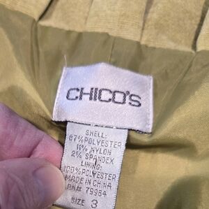 Beautiful jacket is lined, open front. Fold cuffs. Fabric is a micro corduroy with a faint tapestry pattern. 67% polyester, 11% nylon & 2% spandex. Sz M-L...measurements: shoulder-19 ", bust-48", bottom-47", shoulder to hem-26". By Chicos