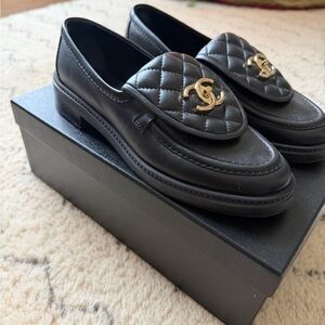CHANEL Black and Gold Quilted Loafers