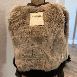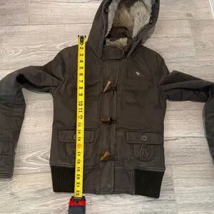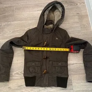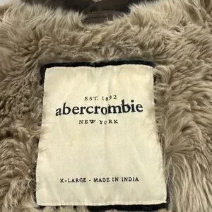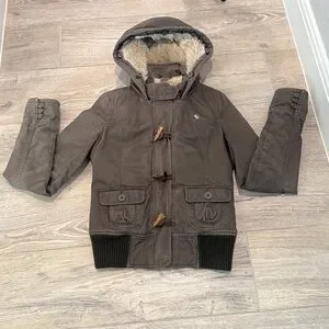 The jacket is a vintage Abercrombie & Fitch faux fur-lined hooded jacket. This style, often referred to as a bomber or utility jacket, was popular in the early 2000s (Y2K era) and features a zip and toggle closure.