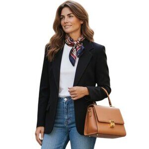 Classic Giorgio Sant Angelo black blazer crafted from a luxury Italian wool-cashmere blend, tailored in Europe. Features a clean single-button front, structured silhouette, and gold-tone cuff buttons. A timeless piece that layers beautifully over jeans or dresses.