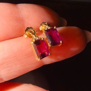 There earrings are a beautiful garnet set in 14K yellow gold. These earrings were bought from Gems TV in the early 1990s. The name rhodolite garnet was given to them because the color is similar to the rhododendron flower.