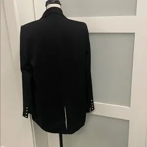 Elevate your wardrobe with this elegant black blazer, featuring a distinctive emblem for a touch of sophistication. Perfect for both professional and casual settings.