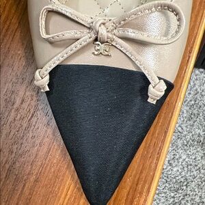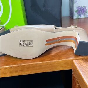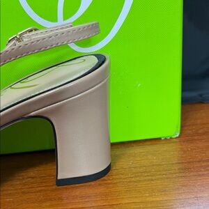 Elegant slingback heels with a tan body and black pointed toe. Stylish and versatile.