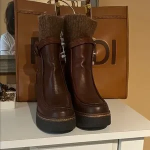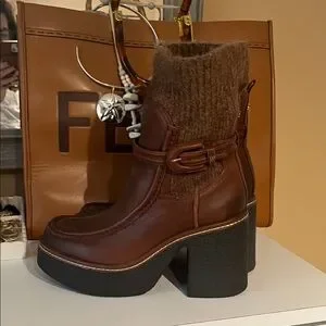 Sam Edelman Elegant brown leather boots with cozy knit cuff. Chunky heel for added height. Perfect for stylish outings. Perfect Condition