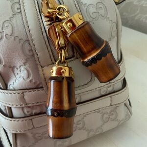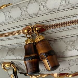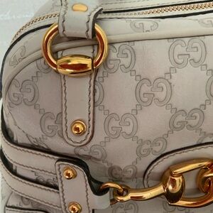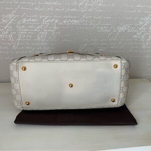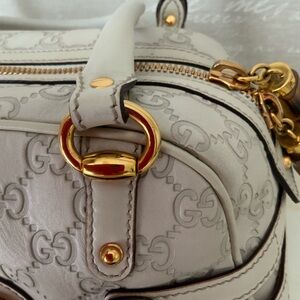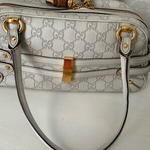 Elegant Gucci satchel with white design. Features luxurious gold accents. Ideal for stylish outings.