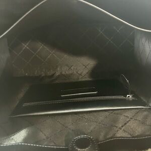 Elegant tote with plush cream shearling. Tan leather handles and trim. Perfect for chic outings.