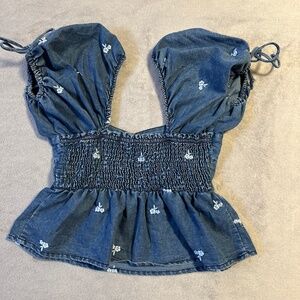 Size medium, see photos for measurements. Faded wash denim with white embroidered flowers. Smocked panel on the back for a flattering fit. Cottagecore, bohemian, boho, prairie, western, Y2K, vintage aesthetic, 70s, romantic, feminine, casual chic, festival wear, southern belle. Dive into the eclectic mix of style with the Sim & Sam Denim Puff Sleeve Top. This medium-sized, cropped blouse blends the casual comfort of a sweetheart neckline with the breezy elegance of short, puff sleeves. Perfect for a variety of occasions, from a laid-back day at the beach to a bohemian music festival, it offers a versatile addition to any wardrobe. The top features a blue denim fabric, giving it a retro vibe that's ideal for spring and summer wear. With delicate embroidered accents, it captures a blend of Western and hippie themes, complemented by a regular fit that ensures easy movement. The machine-washable cotton material makes it a practical choice for daily wear, keeping you stylish and comfortable without the fuss.
