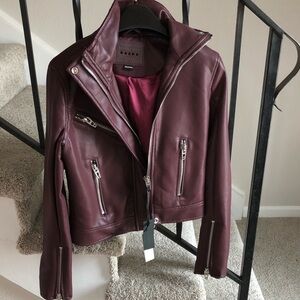 Stylish burgundy leather jacket. Features classic biker design. Zipper details add edge.