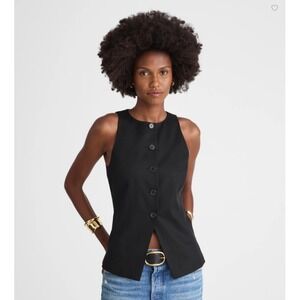 Keywords: tailored vest, sleeveless top, black vest, workwear, smart casual, minimalist, sophisticated, classic, button front, cutaway detail, Madewell vest, business casual, chic layering