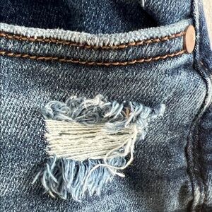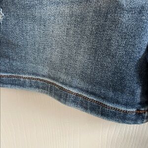 Stylish dark wash jean shorts. Features distressed details. Perfect for casual outings.