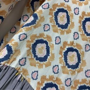 EUC. Small. This is the Matilda Jane Visionary Dress, known for its bohemian and cottagecore style with mixed floral and geometric patterns. It features a v-neck with lace trim, long sleeves, and a tiered skirt.