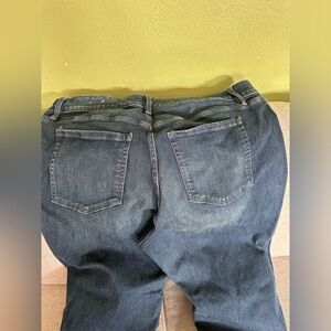 Stylish dark blue jeans with a straight leg design. Comfortable and versatile for everyday wear. High rise curvy fit in a size 20 short. Stretch fabric.