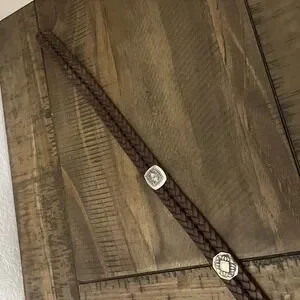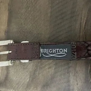 This is a Brighton brown leather braided belt in size 28 for women. It features a silver buckle and conchos, giving it a designer and classic look. The belt has studded accents and is made of high-quality leather with stainless steel hardware. It is a stylish accessory that adds a metal-themed touch to any outfit.