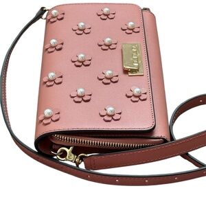 Zac Posen Earthette convertible leather wallet crossbody in a dusty pink color with pearl-encrusted floral appliques and gold-tone hardware
