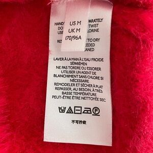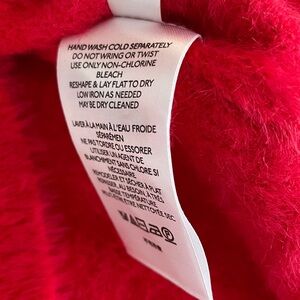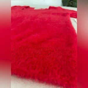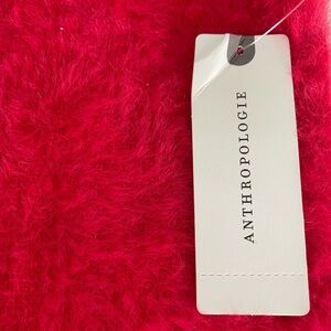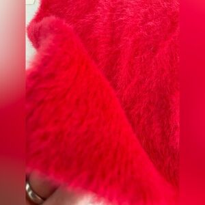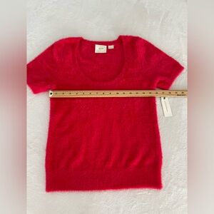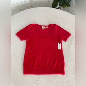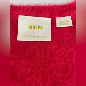 Maeve by Anthropologie Rona Eyelash Sweater Tee in pinkish red. It is made of a blend of nylon, viscose, and polyester, and typically features a scoop or crew neck and short sleeves. This fuzzy, soft-textured sweater is an exclusive design for Anthropologie. Low cut scooped neckline.