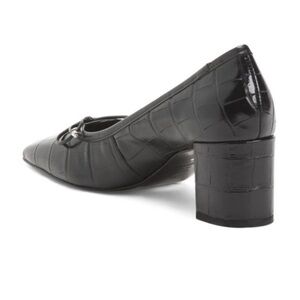 stacked block heel, bow accent, croc embossed