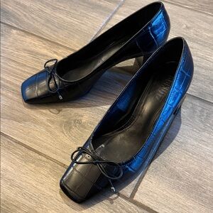 Chic black pumps with a textured finish. Features a stylish block heel and bow detail. Ideal for elevating any outfit. New with box and dust bag. Sz 6 B tiny callout not noticeable at all but I have to mention.