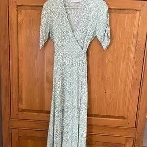 Charming sage maxi dress with delicate floral pattern. Features a flattering wrap design. Ideal for casual elegance.