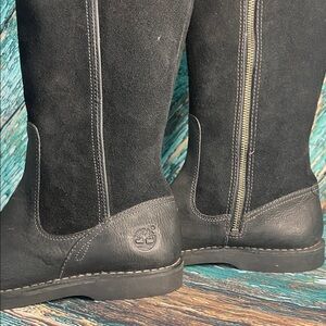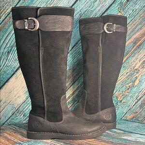Timberland Earthkeepers tall riding boots in black suede and leather with a side zipper and buckle detail. Durable and comfortable for everyday wear. Perfect for adding a touch of elegance.