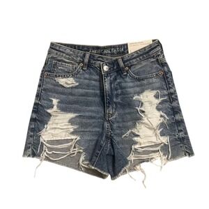 American Eagle Outfitters Highest Rise Baggy Short Comfort Stretch Waistband in Blue Medium Wash Distressed Denim.