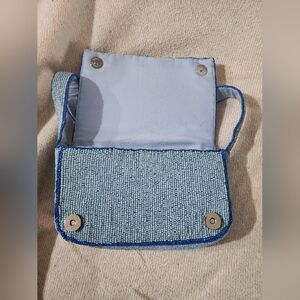 NWT Handcrafted In India Light Blue Sardine Pattern Shoulder Purse w/ Navy Trim