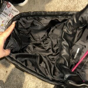 Sleek black puffer vest faux leather. Features a hood and zippered pockets. Perfect for layering. It’s beautiful and well constructed. I lost weight and it’s too big :(