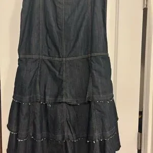 Stylish denim tiered skirt perfect for casual outings. Features a classic blue color that pairs well with any top. Waist 17.5 in