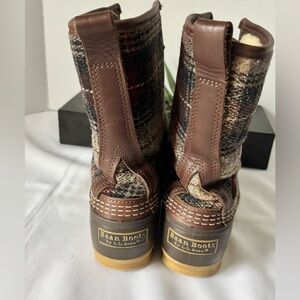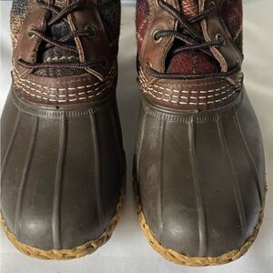 The trendy boots have a rubber bottom a wool shearling lining. The classic, neutral LL Bean has been know for boots that last for years. The boots have a red, black and brown plaid upper, with a chain link bottom for traction in a wet, cold climate. The lamb fur shearling works well in several conditions. Made in Maine. Great for hunting, liking, camping or just a day out these look so cottage core, cabin core, preppy, trendy and warm. SZ 8