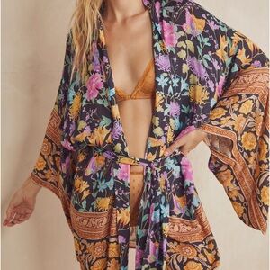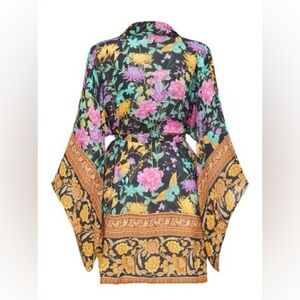The perfect essential, this must-have robe from Spell features a romantic butterfly print with contrast border design in an open, tie-waist silhouette.