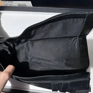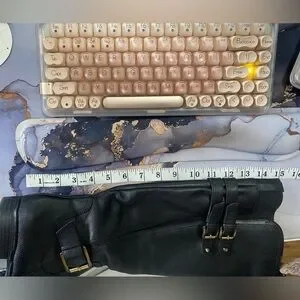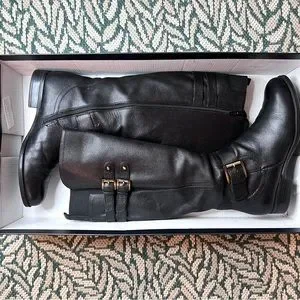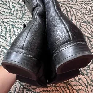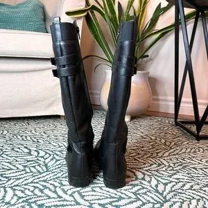 Sleek black leather boots. Knee-high design. Double buckle detail. Perfect for winter.