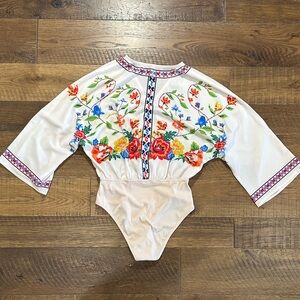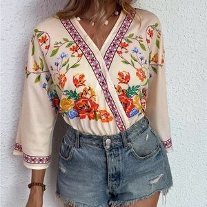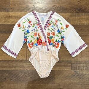 Elegant bodysuit with vibrant floral designs. Features a V-neck and long sleeves.