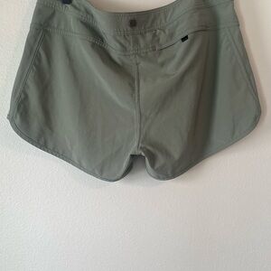 Women’s prAna board shorts / hybrid swim shorts in a versatile olive green color. Designed for surfing, swimming, paddleboarding, beach days, or casual active wear. Lightweight, quick-dry fabric with a drawstring waist for a secure fit in and out of the water.