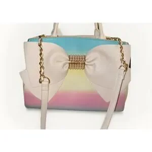 Add a statement piece to your collection with this gorgeous Betsy Johnson bow satchel bag! Featuring a dreamy pastel rainbow ombré design, oversized bow with pearl center detail, and gold-tone hardware, this bag is both playful and chic.